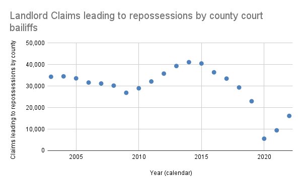 Curiously similar data from the same source but for landlord repos of tenants, the numbers have been static for a shorter time frame. So tenants might not be getting bailed out and there's no sign they will be... until the pandemic years.